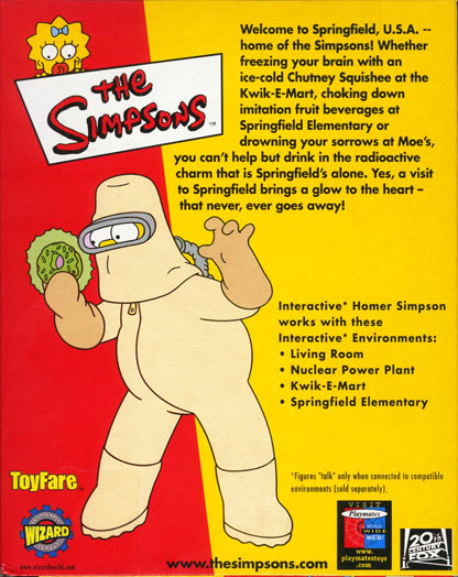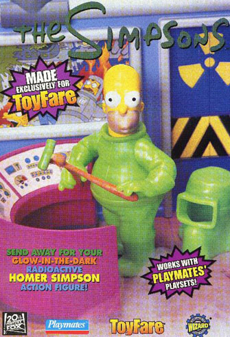 later, in the September 2000 issue, I see this: Radioactive Homer! Yup, Homer Simpson, in a glow-in-the-dark radiation suit. Now, the Simpsons action figures have been flying off the shelves in the US, but they haven't come to Canada yet. I figured that this might be my only chance to get a Simpsons action figure. I knew I had to get it. So, I filled out the special order form and envelope with loving care, stuck a money order for $15(US) in the mail, and now I wait. My logic is working like this: I sent away for Geordi at the start of July, and he came at the end of January. So, sending away for Homer at the start of August means he should be here near the end of February. Hence, the countdown clock on the main page is set for February 28, 2001: the day I send off an angry letter. A few things make this different from Geordi. Unlike Geordi, Homer here is limited to a production run of 10,000. That means first come, first served. Here in lies the possibility that I may not get a Homer. But, I remain optimistic. And so, we count down the days until: a) I get Homer! b) I get my money back (meaning they ran out)! c) I write an angry letter. So, always come back to this page, for the latest on The Countdown To Radioactive Homer! Back to the Main Page |